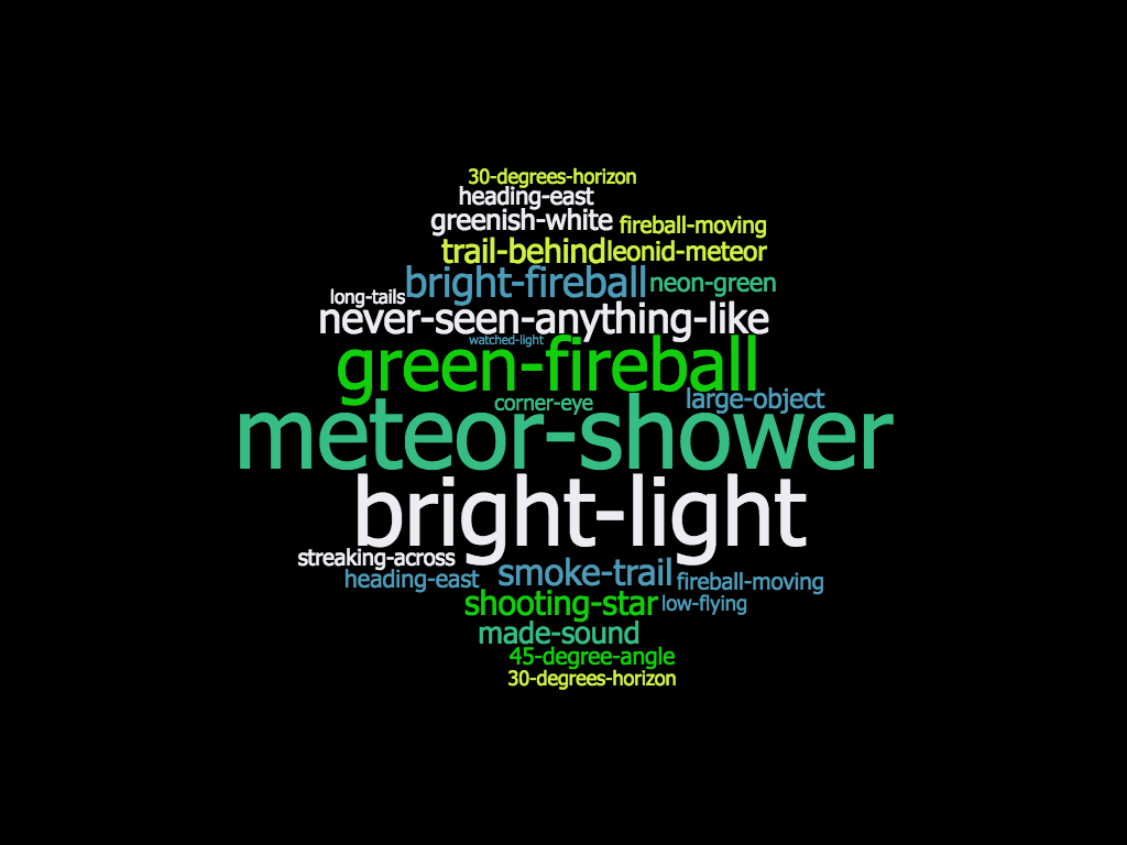 [‘longer’ ‘long’ ‘little’ ‘line’ ‘light sky’ ‘length’ ‘left’ ‘look’ ‘end’ ‘heard’ ‘headed’ ‘flew’ ‘flashing’ ‘first thought’ ‘fireworks’ ‘firework’ ‘fireball’ ‘fire’ ‘flight’ ‘feet’ ‘far’ ‘faded’ ‘extremely’ ‘ever’ ‘event’ ‘evening’ ‘even’ ‘fast’ ‘fly’ ‘flying’ ‘followed’ ‘head’ ‘happened’ ‘half’ ‘ground’ ‘green’ ‘got’ ‘gone’ ‘going’ ‘yellow’ ‘go’ ‘glowing’ ‘glow’ ‘get’ ‘front’ ‘friend’ ‘formation’ ‘following’ ‘heading’ ‘information’]