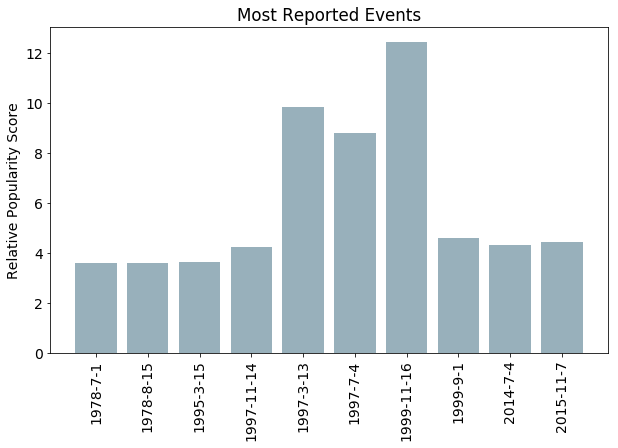 After doing the cluster analysis, I wanted to take a deeper look. The Most Reported Events analysis left me curious about three dates that had particularly high relative popularity scores: