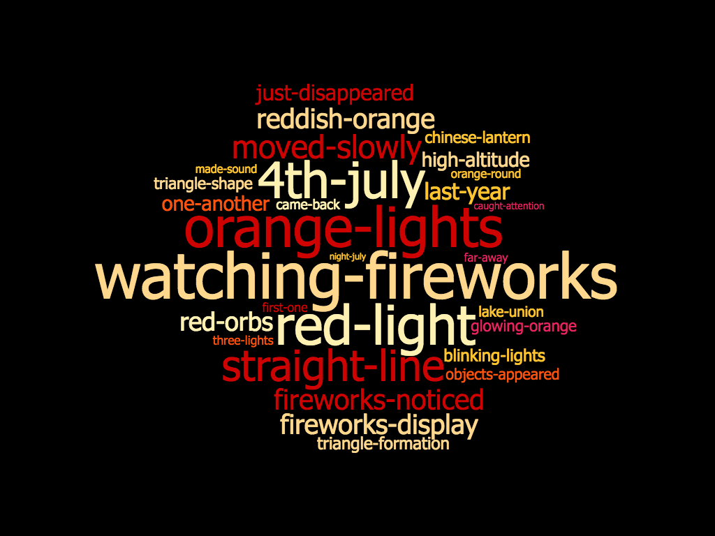 The colors orange and red were most dominant for the 2014 event, multiple objects were also referenced (e.g ‘formation’, ‘objects appeared’, ‘one another’, ‘three lights’). The sightings were observed in 38 States and had no obvious geographic pattern. I did not find any news reports for the sightings on Independence Day 2014, however a Google search returns this interesting youtube video which appears to show lights moving in formation. Further digging brought my attention to the popularity of personal drones around this time. It’s possible drones were filming fireworks from above, capturing the attention of those watching fireworks displays across the country. As for multiple objects flying in formation? Researches submitted their work on autonomous coordinated flocks of drones earlier that year. Perhaps some enthusiasts were experimenting with coordinated flight that night?